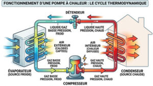 Le fonctionnement d’une pompe à chaleur repose sur la thermodynamique. Contrairement à une chaudière classique qui brûle un combustible, la PAC, pour sa part, transfère l’énergie thermique d’un milieu extérieur (air, eau ou sol) vers l’intérieur de votre habitat.
